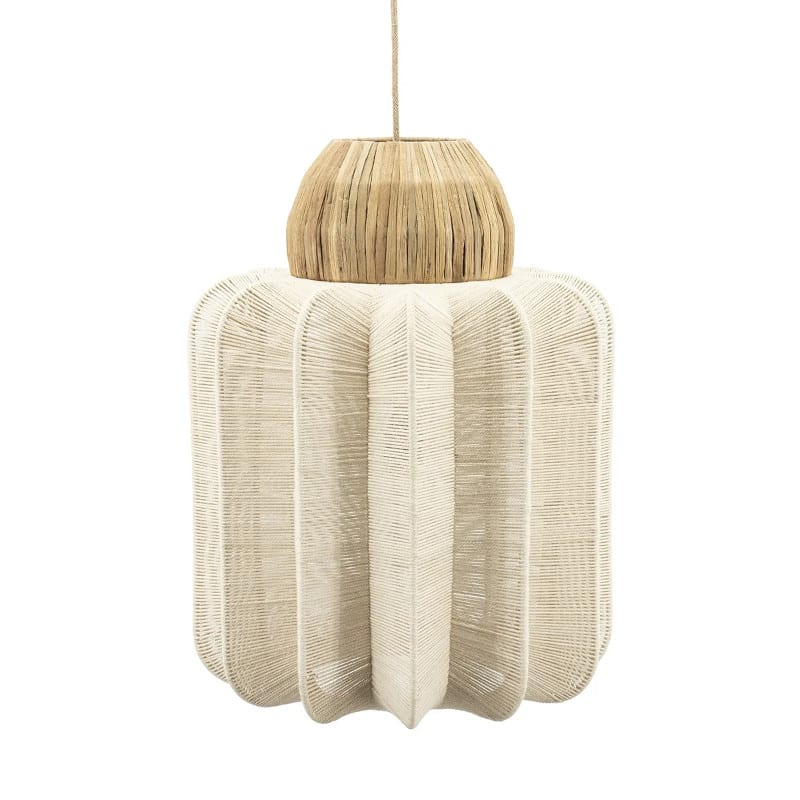 Cette suspension se distingue par son mélange de matériaux naturels. Le coton apporte une douceur visuelle. Le jonc de mer et le sisal offrent une texture brute et organique. Le fer structure l’ensemble avec une touche industrielle subtile. Cette combinaison crée un luminaire original et plein de charme.